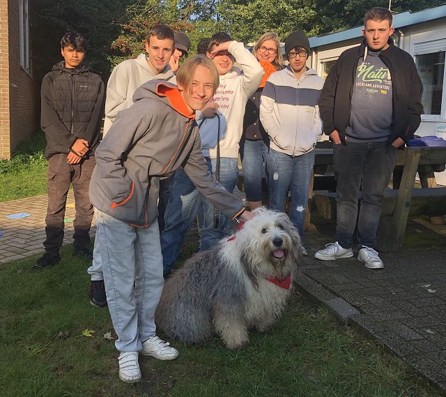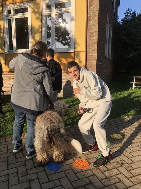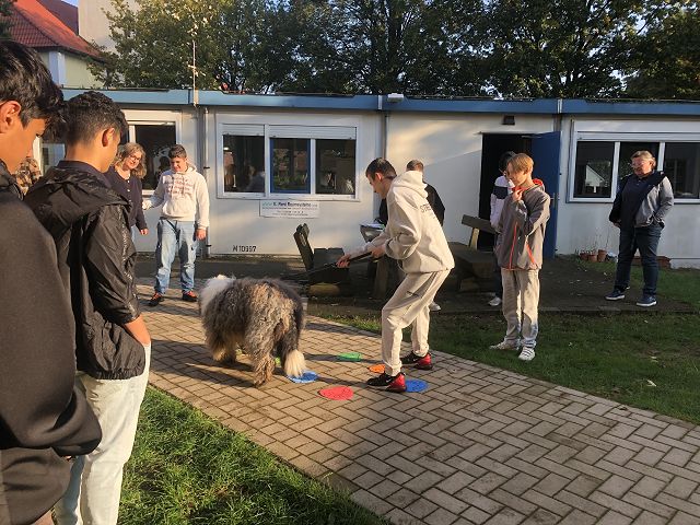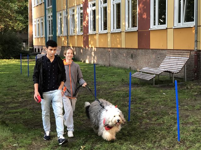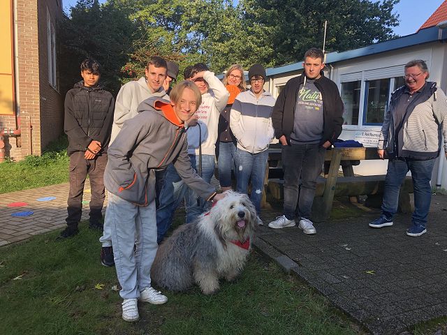 Die Klasse 9c hatte heute einen besonderen Gast eingeladen. Sally, ein ausgebildeter Schulbegleithund, zeigte sein Können im Umgang mit Schülern. Unter der Anleitung von Sally´s Frauchen, Frau Martina Lade, erprobten sich die Schüler im Umgang mit einem Hund. Sally wurde durch einen Parkour geführt, suchte Fragen für die Schüler mit der Pfote aus und begeisterte mit seiner freundlichen Art.