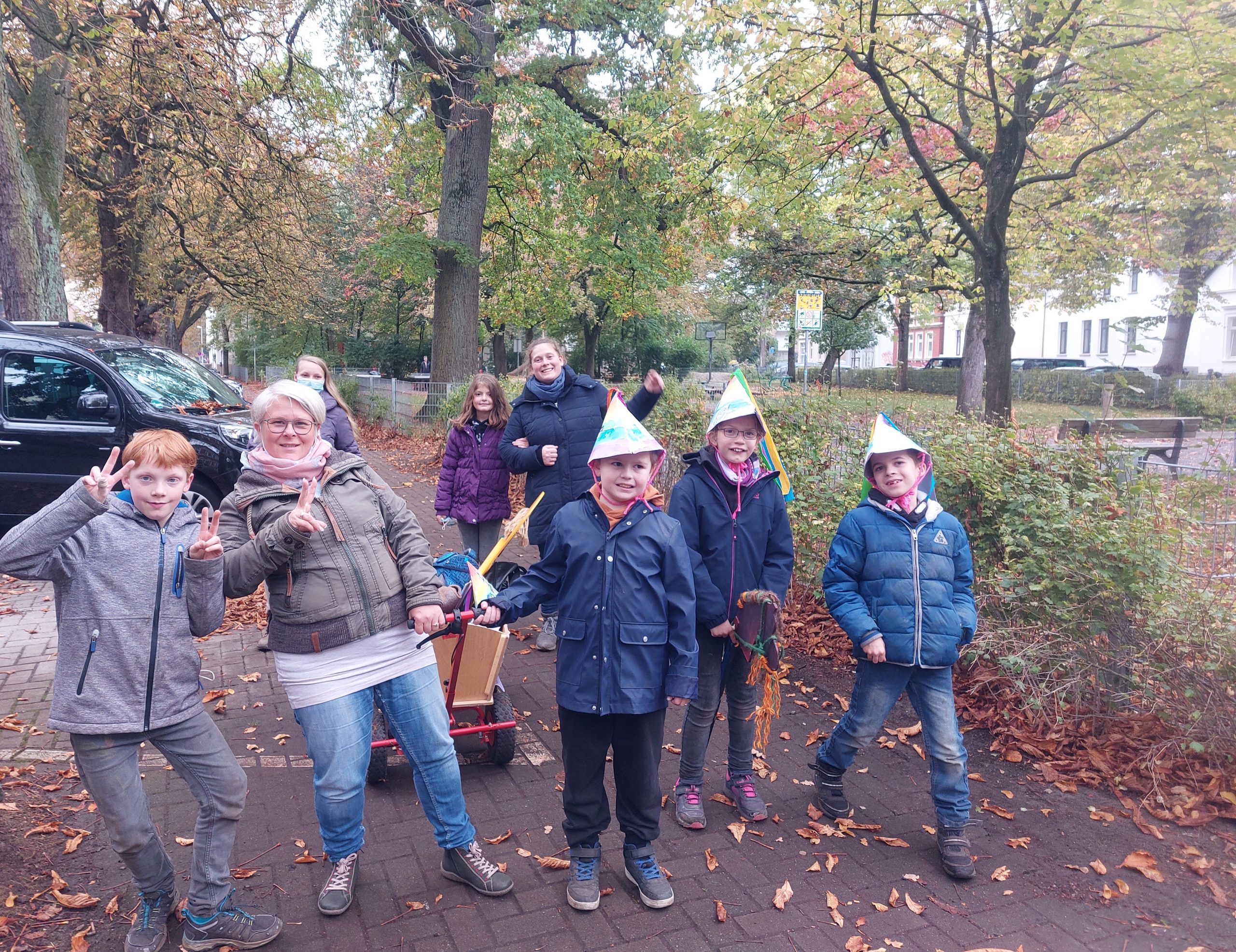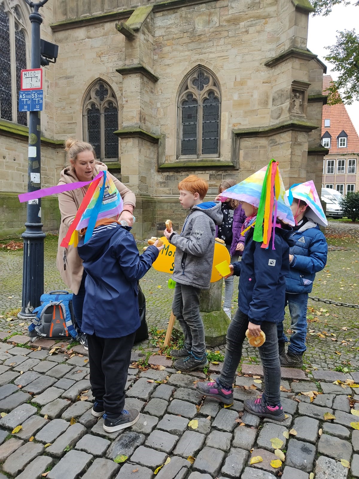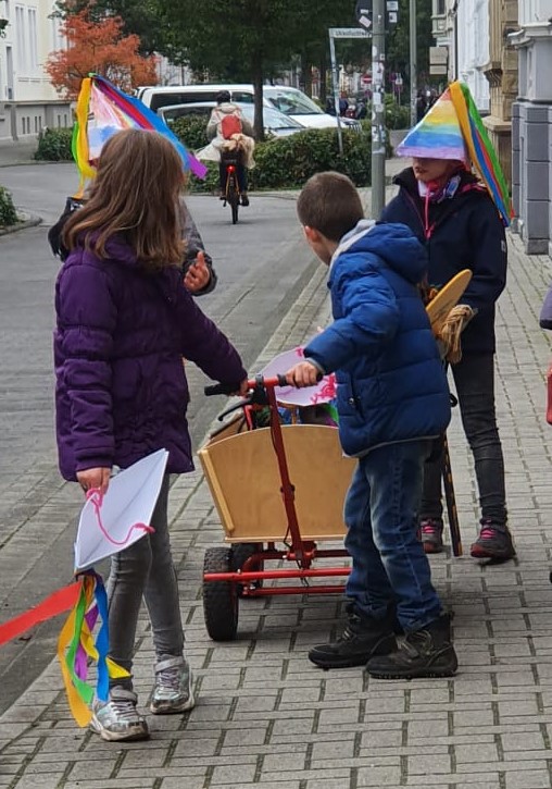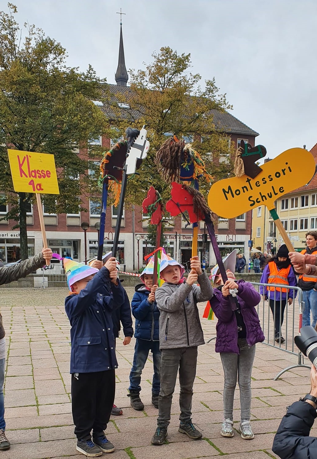 Auf dem Weg in die Stadt haben wir viel gesungen und sorgten auch mit den bunten Hüten und Steckenpferden für großes Aufsehen, sodass viele Menschen, die uns begegneten, uns fröhlich begrüßten.