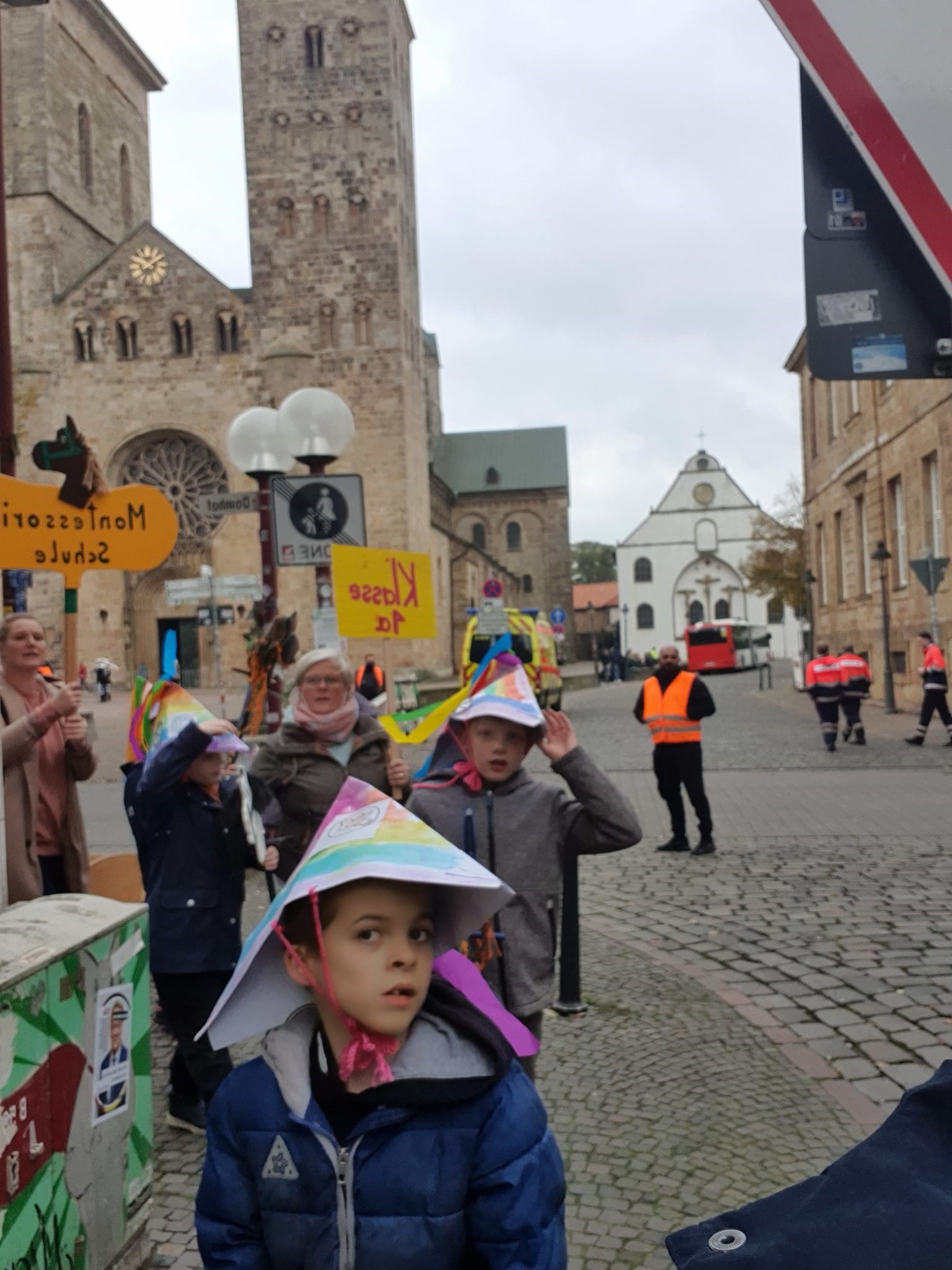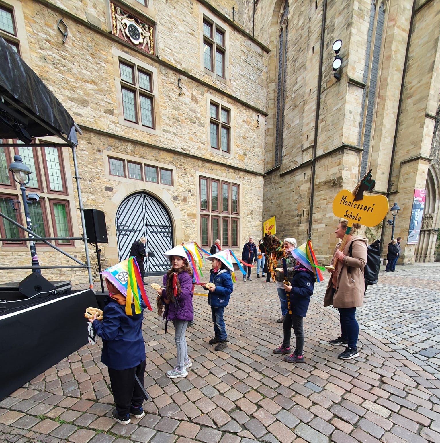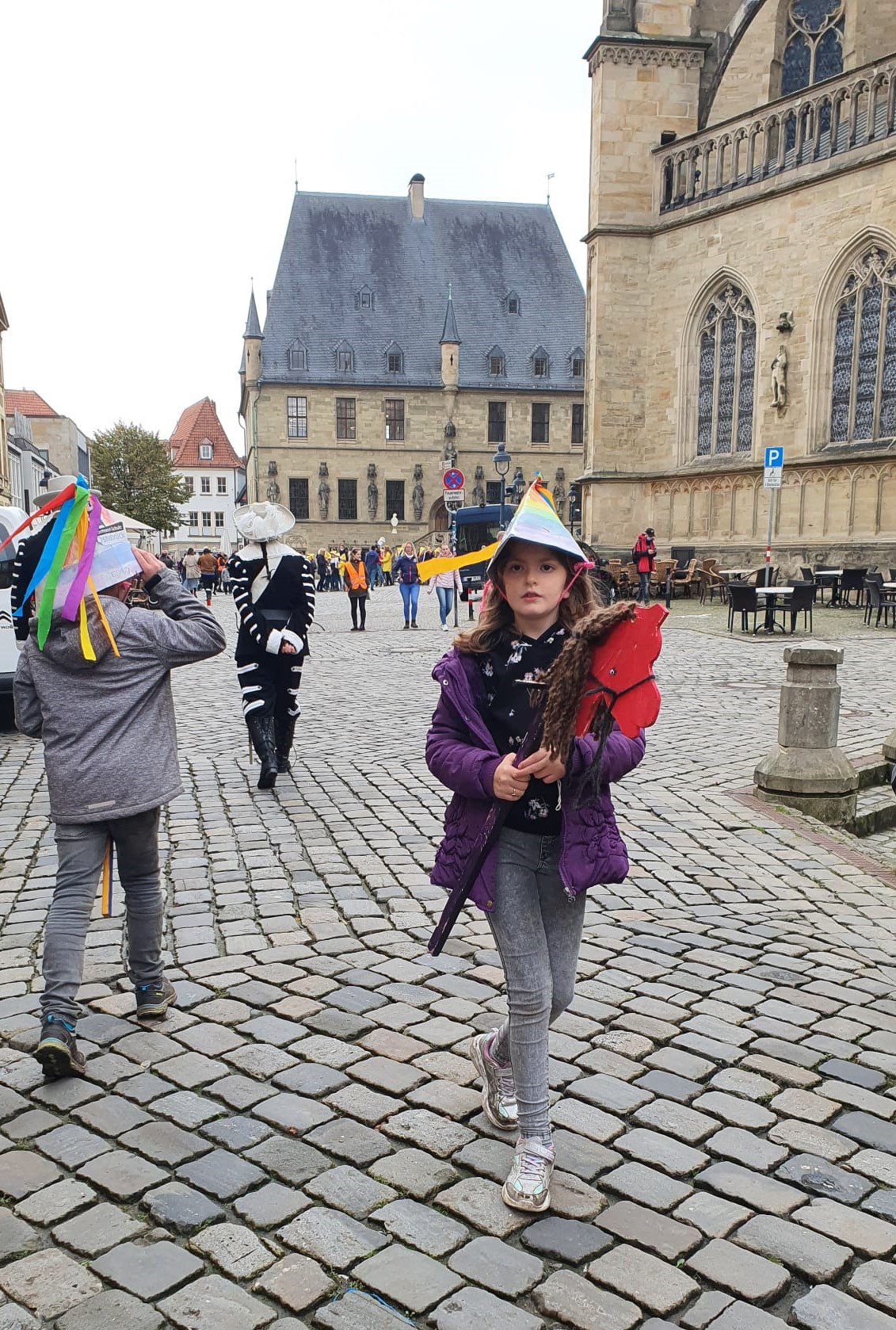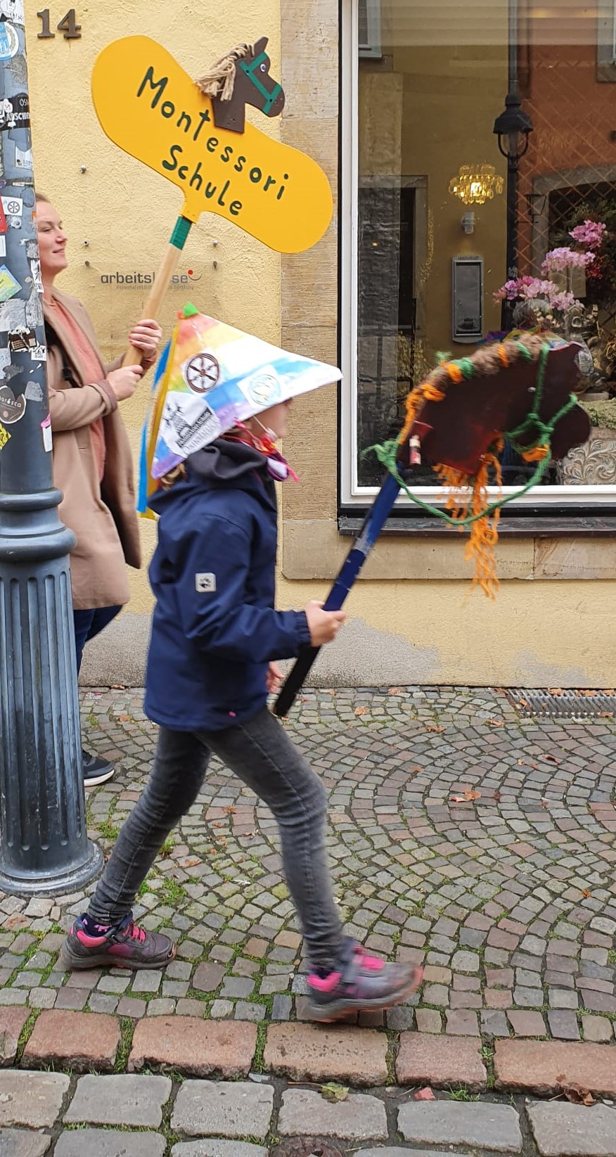 Auf dem Weg in die Stadt haben wir viel gesungen und sorgten auch mit den bunten Hüten und Steckenpferden für großes Aufsehen, sodass viele Menschen, die uns begegneten, uns fröhlich begrüßten.