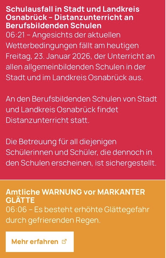 die Schulträger der Stadt und des Landkreises Osnabrück haben um 06:21 Uhr den Schulen mitgeteilt, dass heute, den 23.01.2026 witterungsbedingt der Unterricht ausfällt.