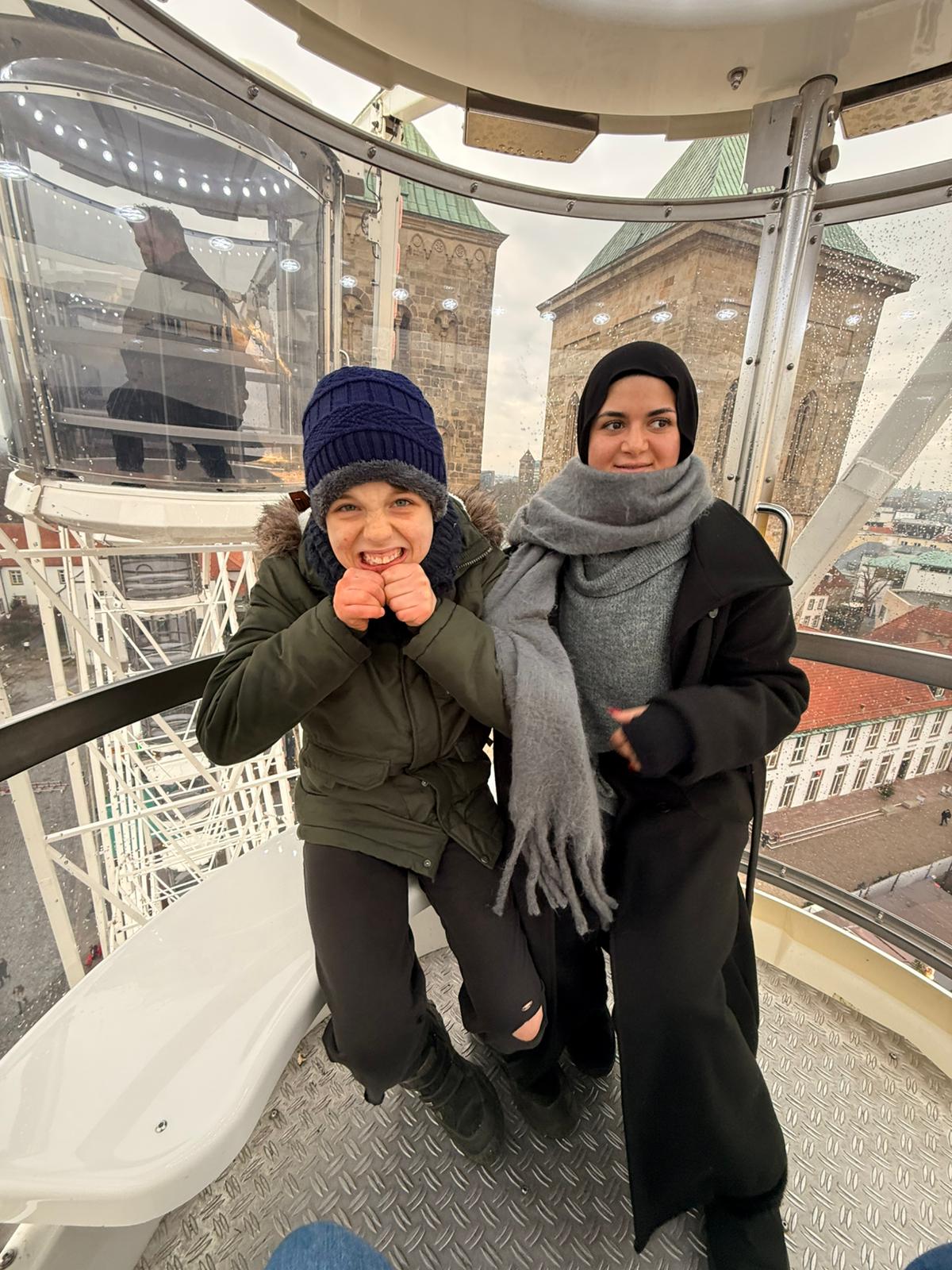 Die Klasse 7c hatte einen besonderen Wunsch: einmal mit dem Riesenrad auf dem Osnabrücker Weihnachtsmarkt zu fahren. Um sich diesen Wunsch zu erfüllen, bereitete sich die Klasse auf dem Adventsbasar mit viel Engagement vor. Unter anderem wurden liebevoll gebackene Cookies sowie Sandwiches verkauft. Dank der Einnahmen konnte Mailinda nicht nur eine Fahrt mit dem Riesenrad genießen, sondern sich auch einen Crêpe auf dem Weihnachtsmarkt leisten. Mehrere Schülerinnen und Schüler überwanden dabei ihre Höhenangst und erlebten Osnabrück aus einer ganz neuen Perspektive – hoch über den Dächern der Stadt. Meiilinda nahm den Ausflug im Rollstuhl teil und zeigte sich besonders erfreut über die aufmerksame Unterstützung durch Najerra. Begleitet wurde die Klasse auch vom dem ehrenanmtlich tätigen Ghassan Elbatich. Ein Tag voller Mut, Gemeinschaft und weihnachtlicher Stimmung, der allen Beteiligten in schöner Erinnerung bleiben wird. 🎄🎡