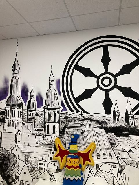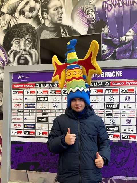 Meilinda machte eine gute Figur in der Umkleide der Spieler, die leider nicht da waren… Hier ein Bild vor der Osnabrücker Stadtkulisse