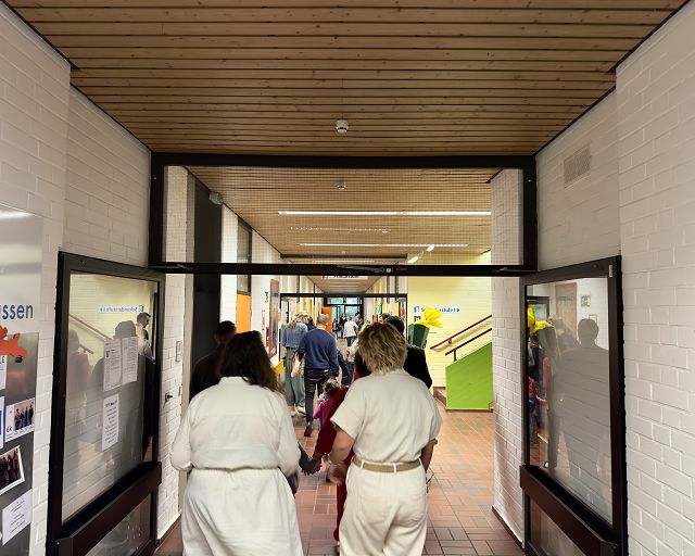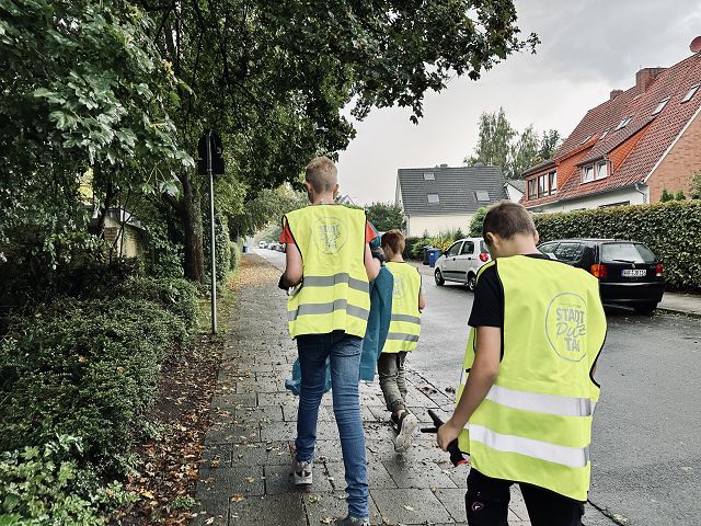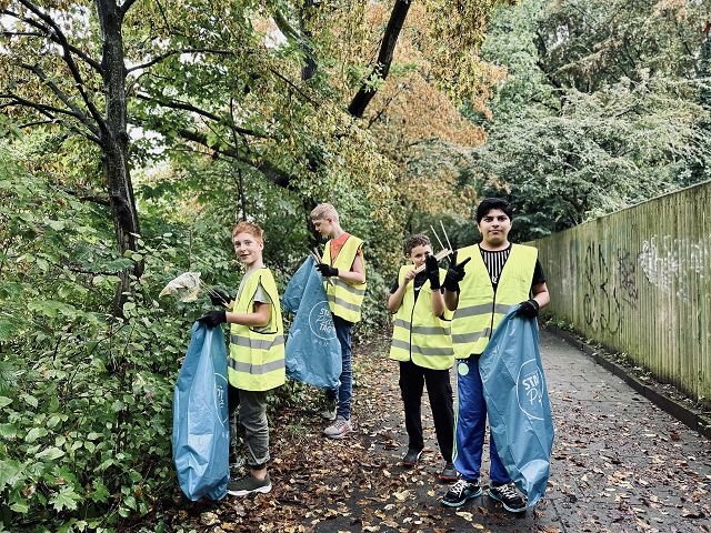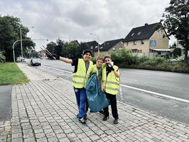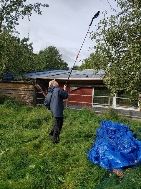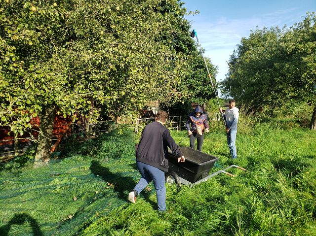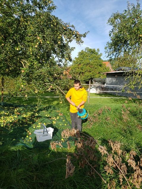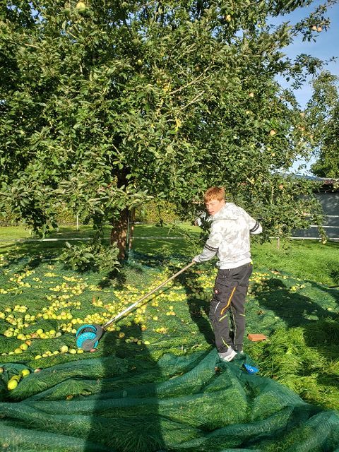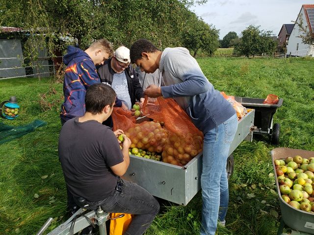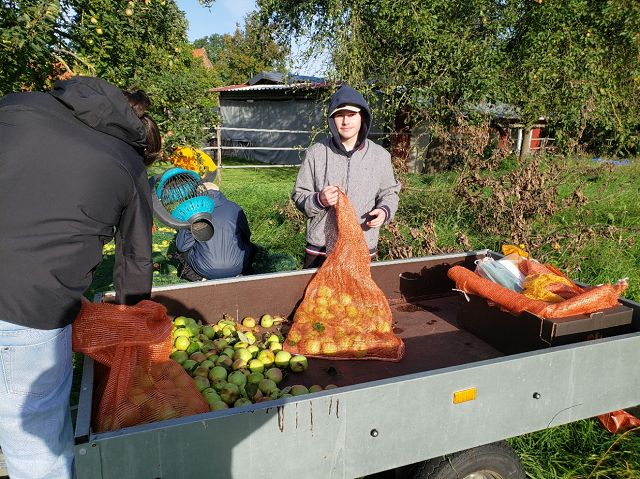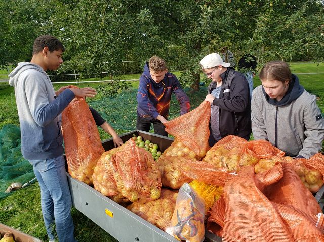 (Anja Pauli-Dostmann) Wir waren mit acht Schülern der Sek 2 bei Frau Wesselmann in Westerkappeln um dort Äpfel und Birnen zu pflücken. Das Obst wird gepresst und wir werden den fertigen Apfelsaft in unserem Café oder auch in 5 l Gebinden an interessierte Apfelsafttrinker in der Schule verkaufen. Das Wetter war stürmisch, aber trocken. Das Sammeln, Pflücken, aussortieren hat viel Spaß gemacht. Die Helfer waren super motiviert und haben alle prima gesammelt. Zur Belohnung gab es Kürbissuppe, die Frau Wesselmann extra für alle gekocht hatte.