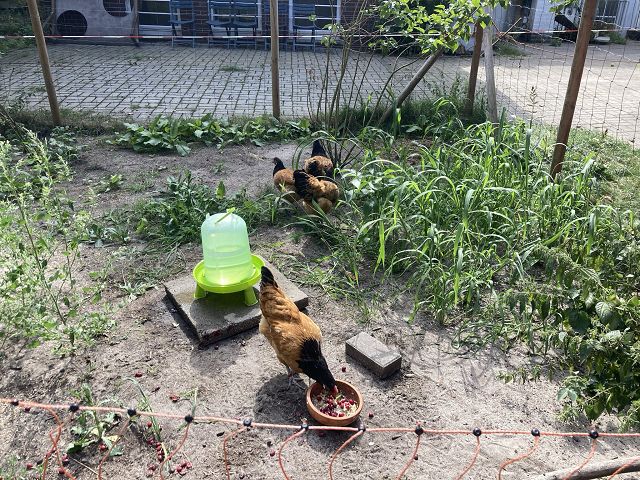 Im Frühjahr 2021 war es soweit und der gefiederter Zuwachs für die Schulgemeinschaft zog ein: 4 Hennen der Rasse Vorwerk.