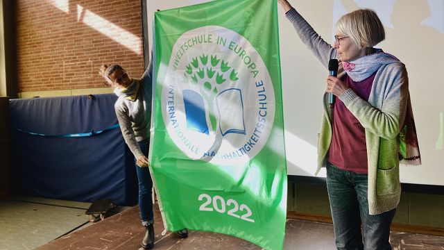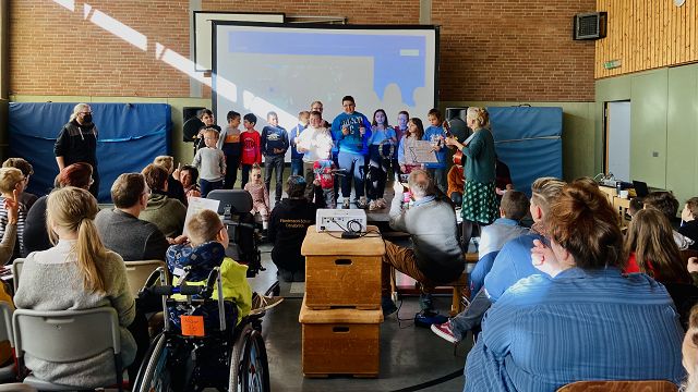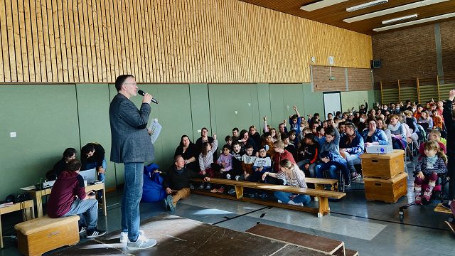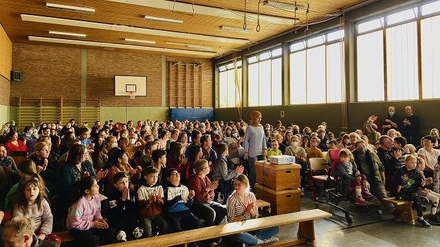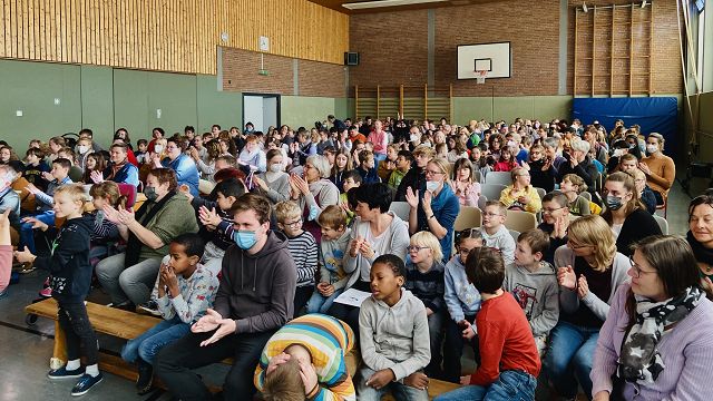 (Uwe Diersmann) Nachdem die Schulversammlungen in den letzten zwei Jahren coronabedingt online stattfanden, war die Anspannung und Freude bei allen Beteiligten besonders groß, heute in der Sporthalle in Präsenz zusammenzukommen. Begrüßt wurden alle durch den Primarstufenchor mit dem „Monte-Song“, der alle Schülerinnen und Schüler zum Mitmachen animierte. Daran anschließend stellten sich die neu gewählten Schülersprecherinnen vor. Ein Schüler präsentierte stolz sein Bild, das als „bestes Bild“ aus einem Malwettbewerb hervorging. Viele Videobeiträge aus dem Unterricht wie „Let’s Dance“ mit Therapiepferd Peo sorgten für bleibende Erinnerungen.