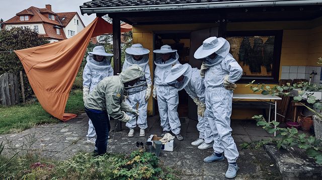 Heute kamen Herr Steinbrinker, Schulleiter der Grundschule und Herr Schomaker in die Klasse und brachten kleine Geschenke mit. Blumen gab es für die Lehrerinnen Frau Festring und Frau Kirschbaum von der Montessori-Schule, die ebenso seit Beginn an dabei gewesen sind wie der Lehrer Herr Dräther von der Schule in der Dodesheide, welcher mit einem Glas Honig von den Monte-Bienen bedacht wurde. Herr Steinbrinker überreichte für alle jeweils ein Päckchen Eier von den schuleigenen Hühnern aus der Grundschule. Für die Schüler*innen hatte Herr Schomaker einen Karton Apfelsaft aus der schuleigenen Ernte der Monte mitgebracht